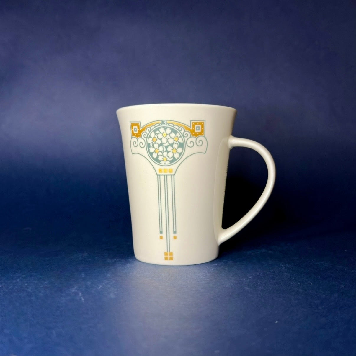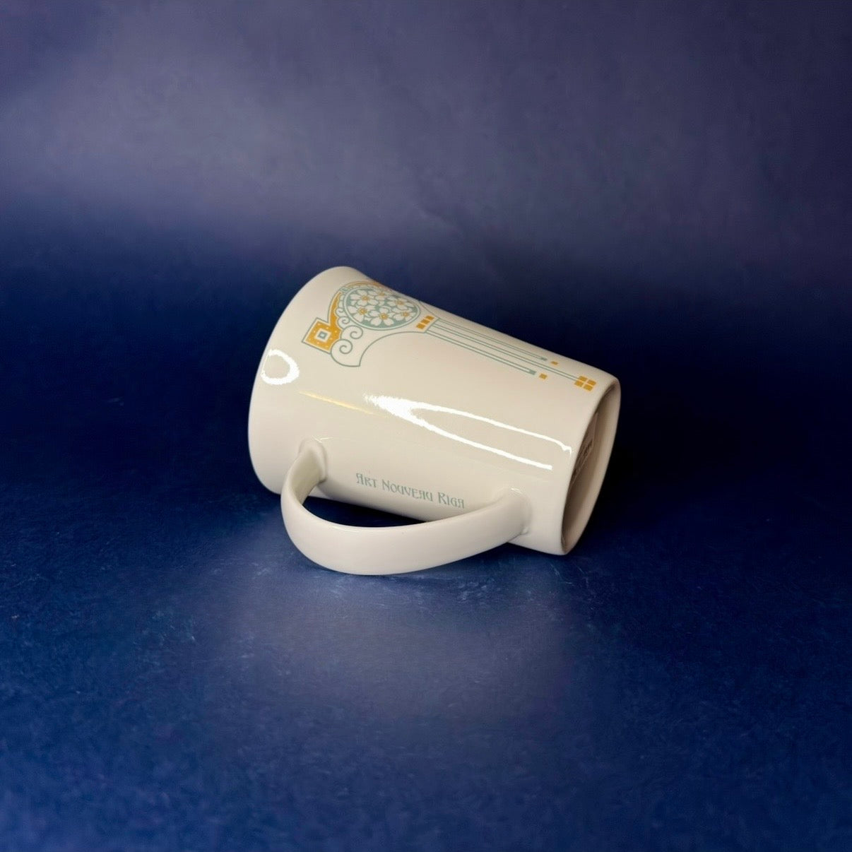 Art Nouveau style porcelain mug with floral ornaments in matte gold and vintage green.