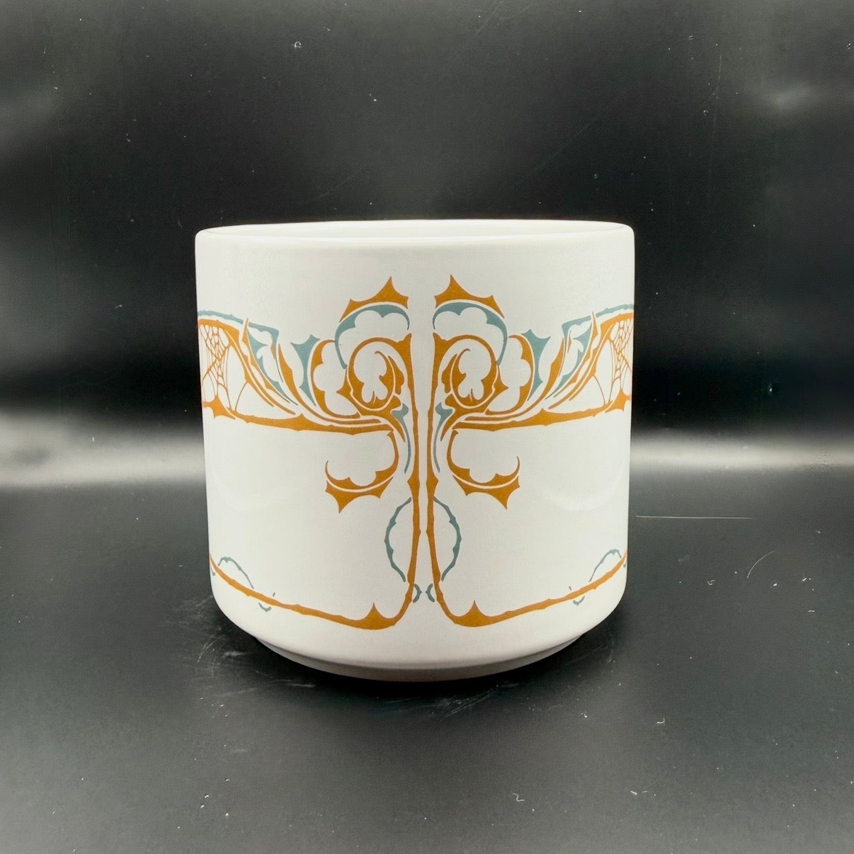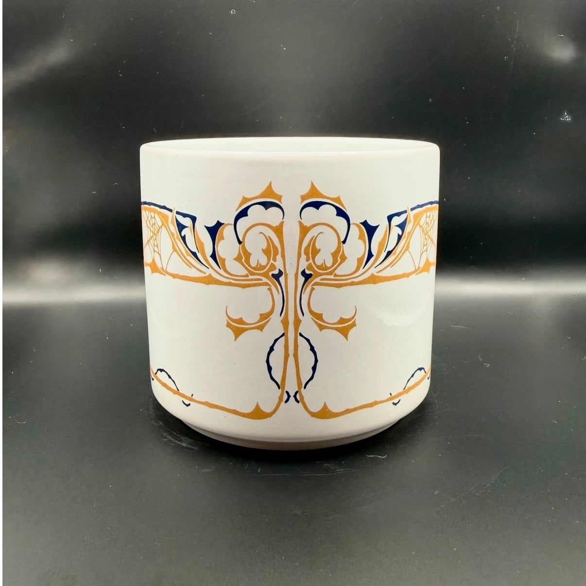 Small and handy porcelain mug adorned with two mystical black cats and stylized spiderweb ornament in matte gold and dark blue.