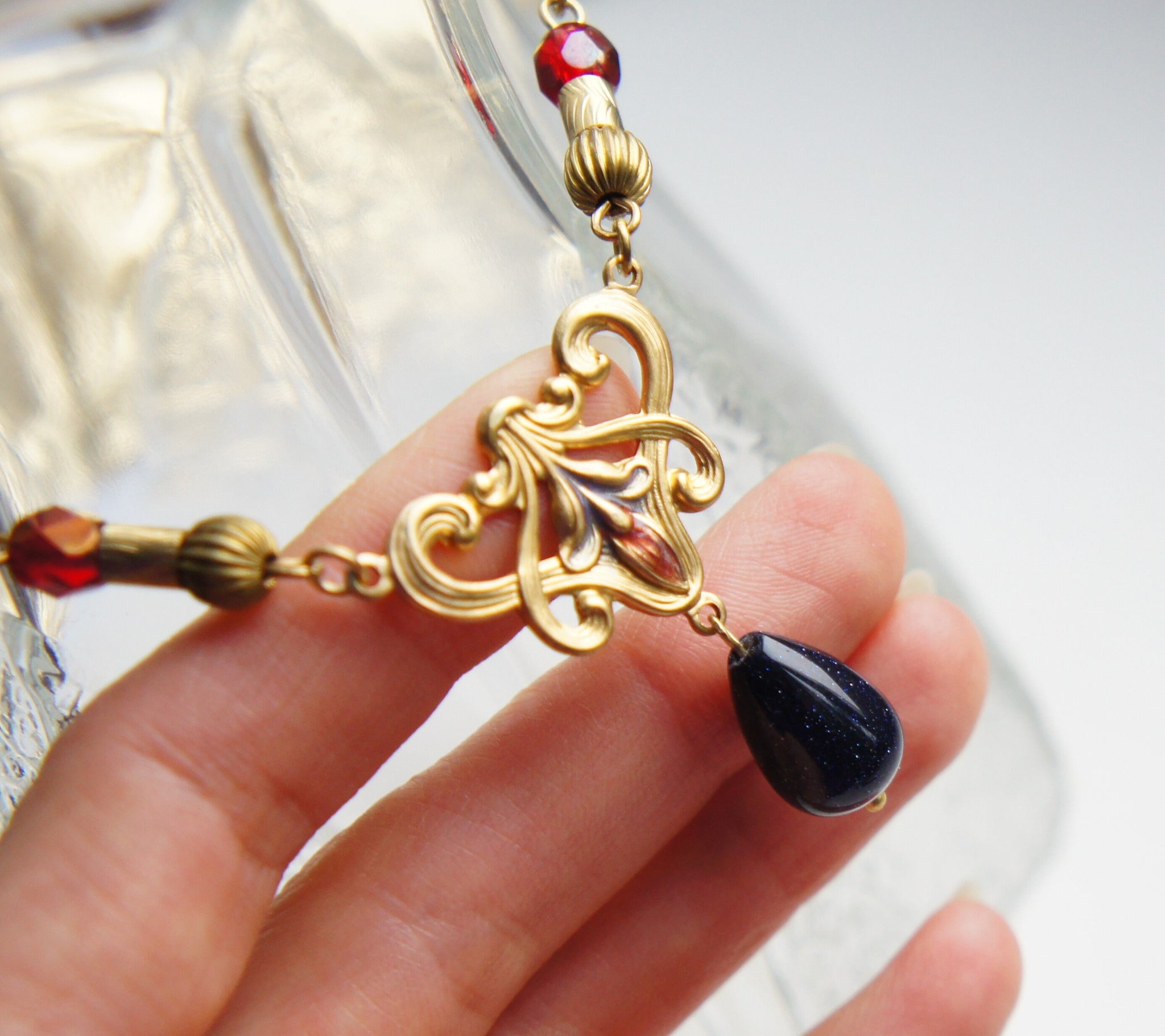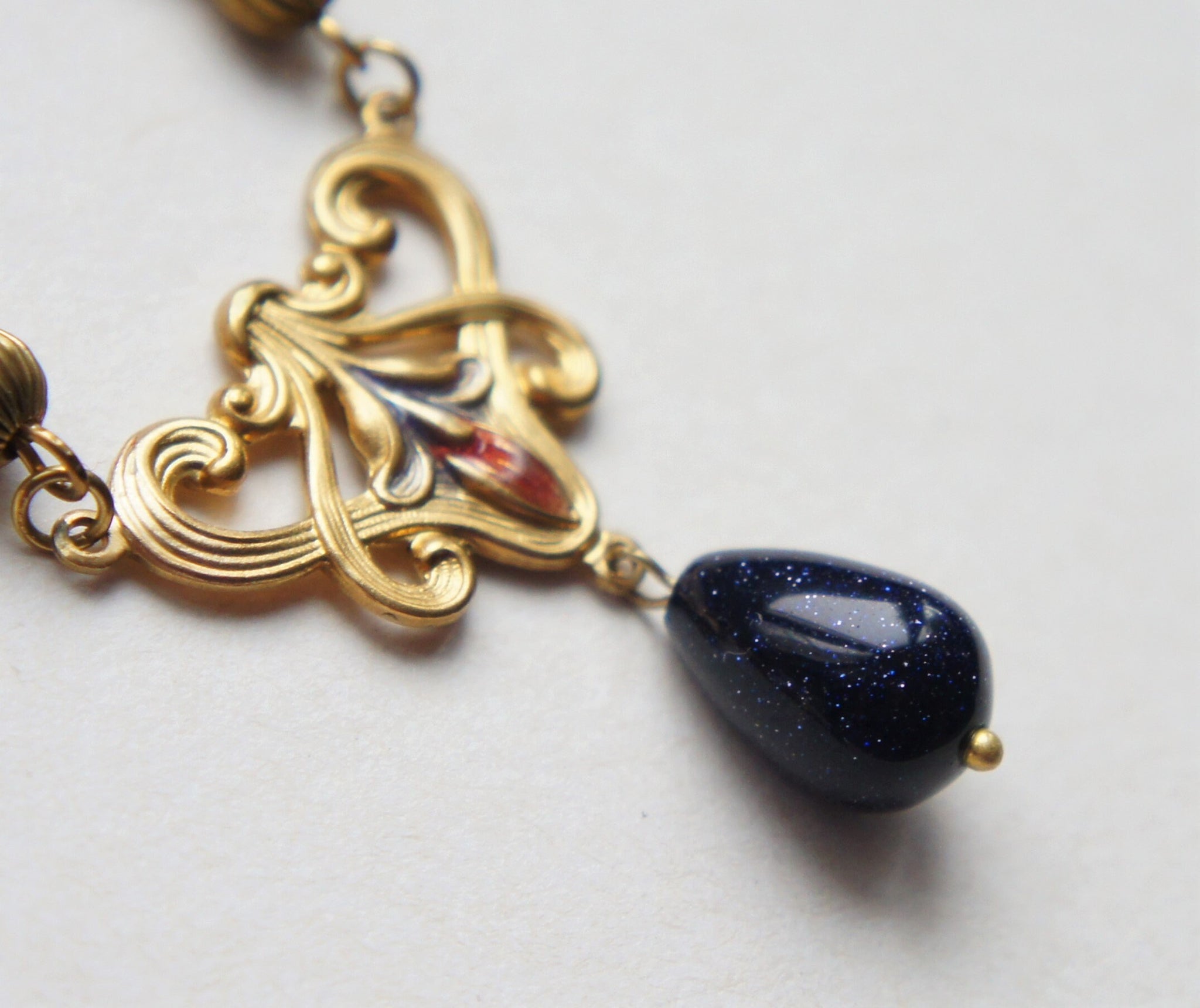 Art Nouveau style necklace decorated with enamel, red Czech glass beads, dark blue Sandstone drop.
