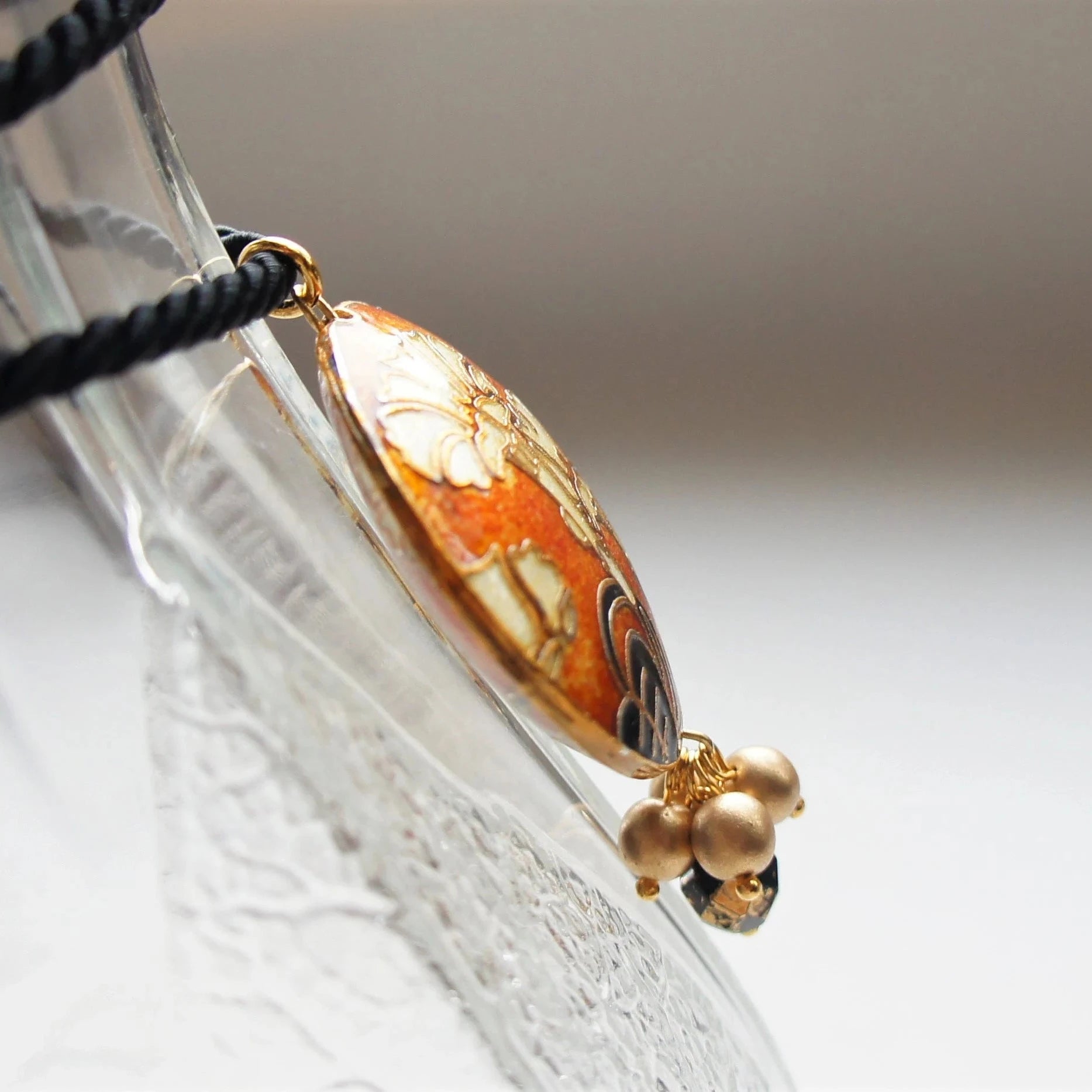 Art Nouveau style Cloisonne pendant in black and orange. Decorated with 5 pc. Czech glass beads.