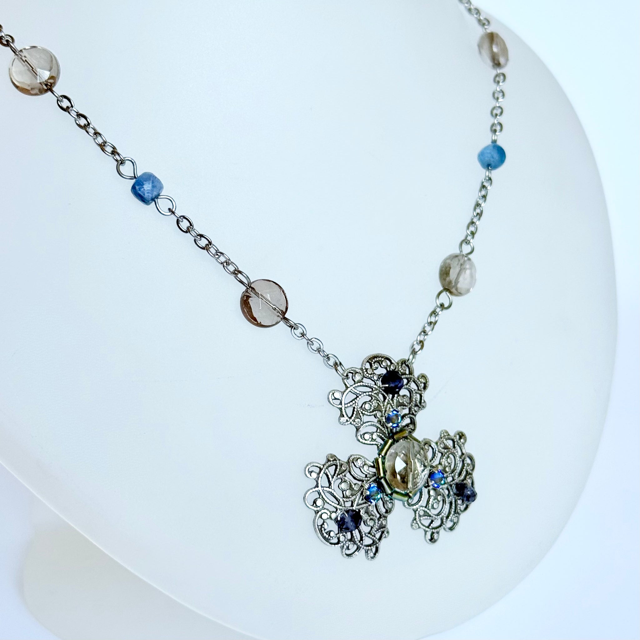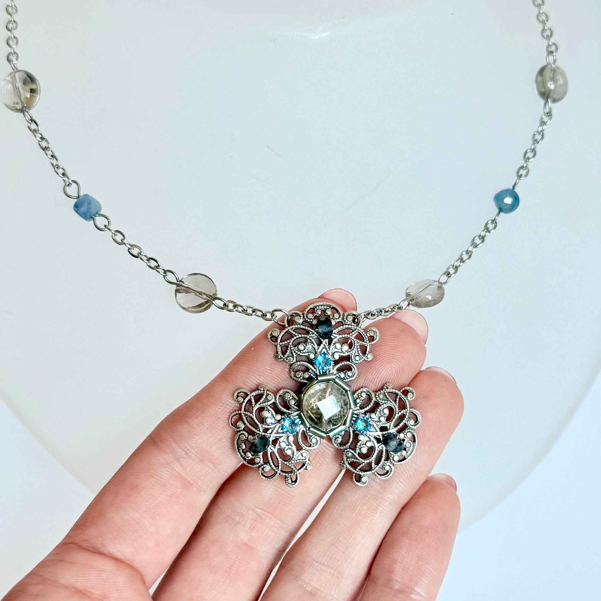 Materials: Quartz stones, lolite stones, blue Kyanite stones, silver plated grey blue Swarovski crystals; Stainless steel chain, silver plated trinity pendant.