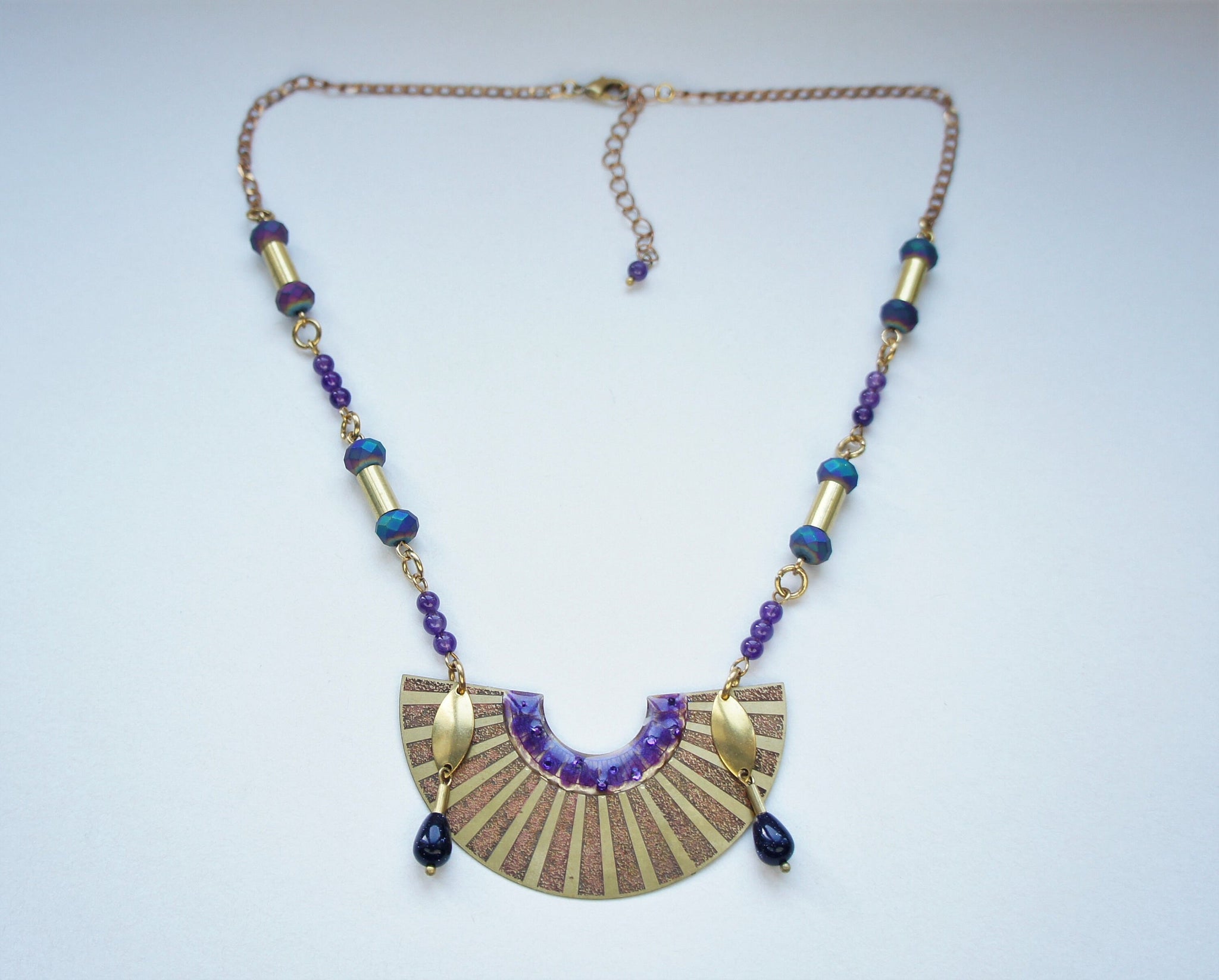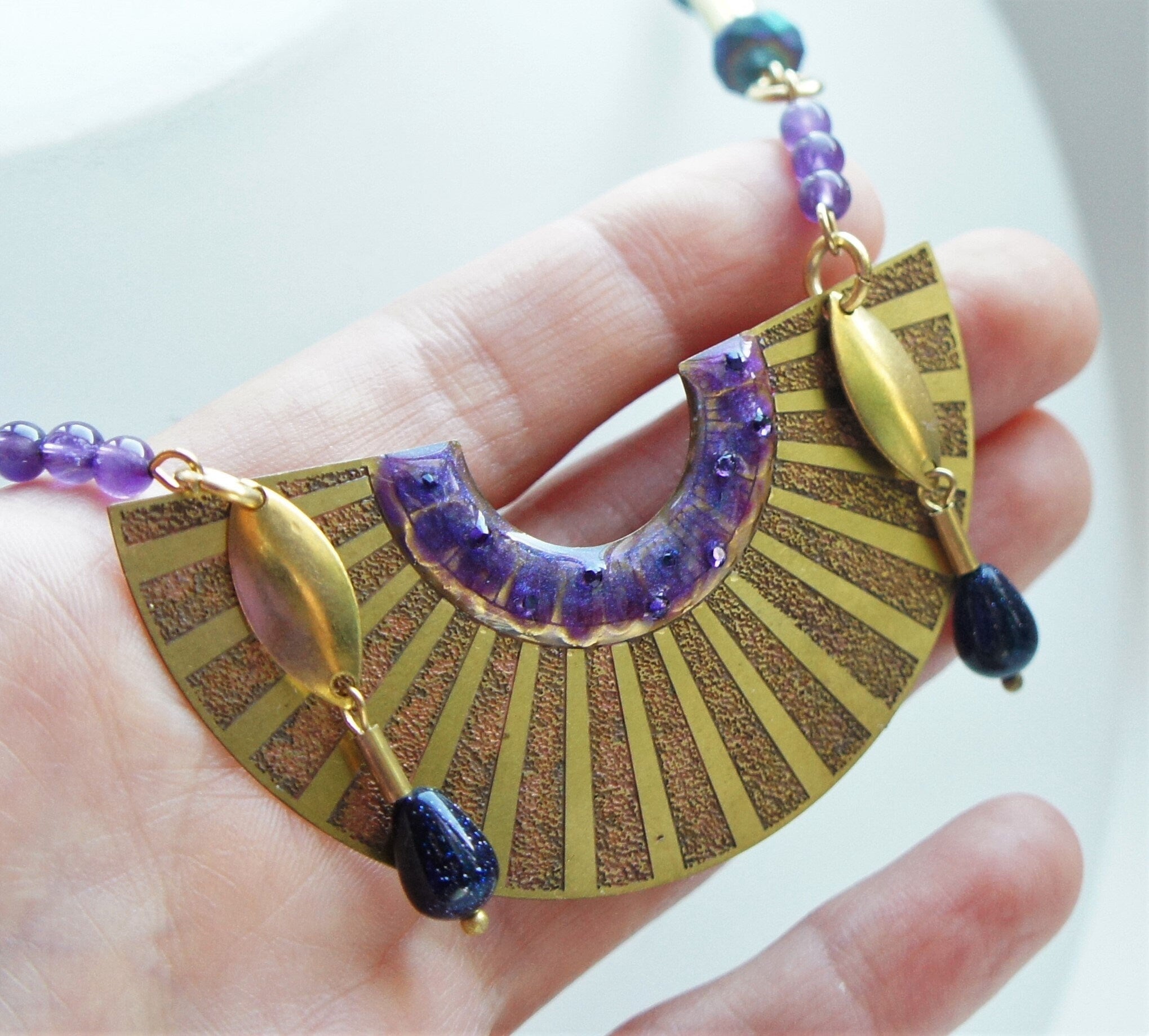 Art Deco Egyptian style necklace decorated with 13 pc. Amethyst stones, 8 pc. green purple glass beads, 2 pc. blue Sandstone drops, purple enamel with Swarovski crystals.