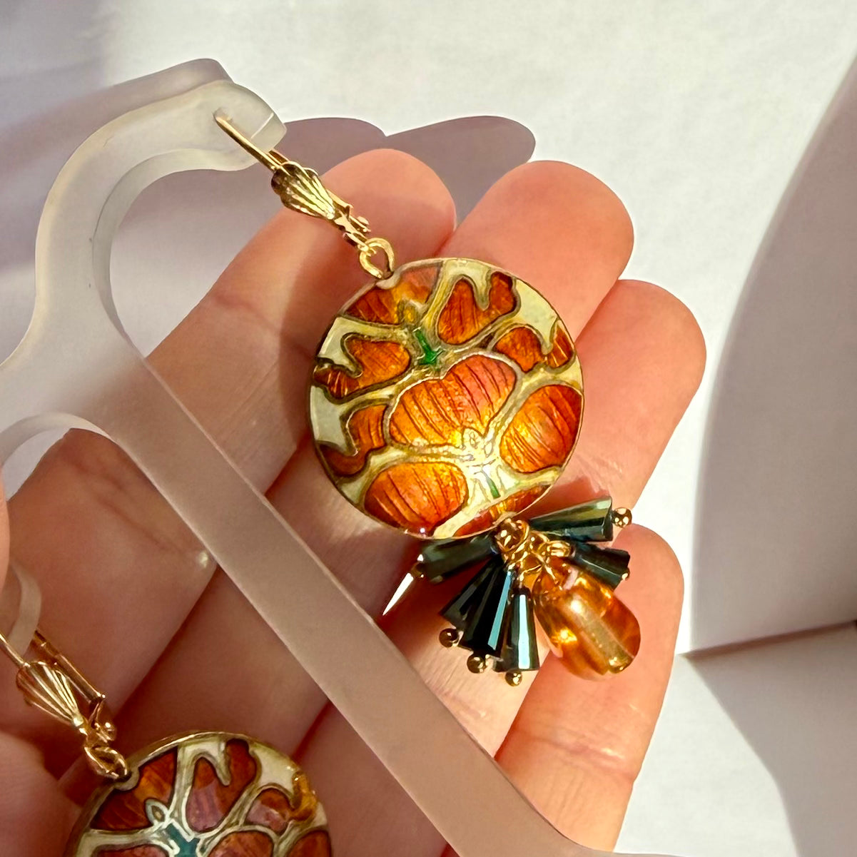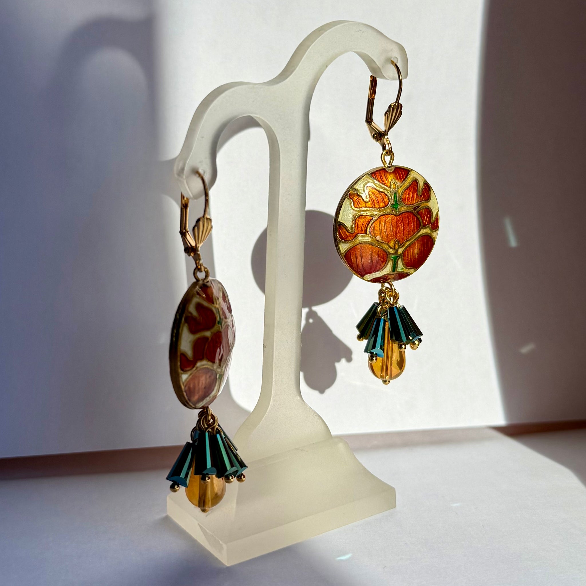 Jūgendstila Cloisonne disks sarkanā krāsā, dekorēts ar stikla pērlītēm. Visas auskaru daļas ir pārklātas ar 24 karātu zeltu.
