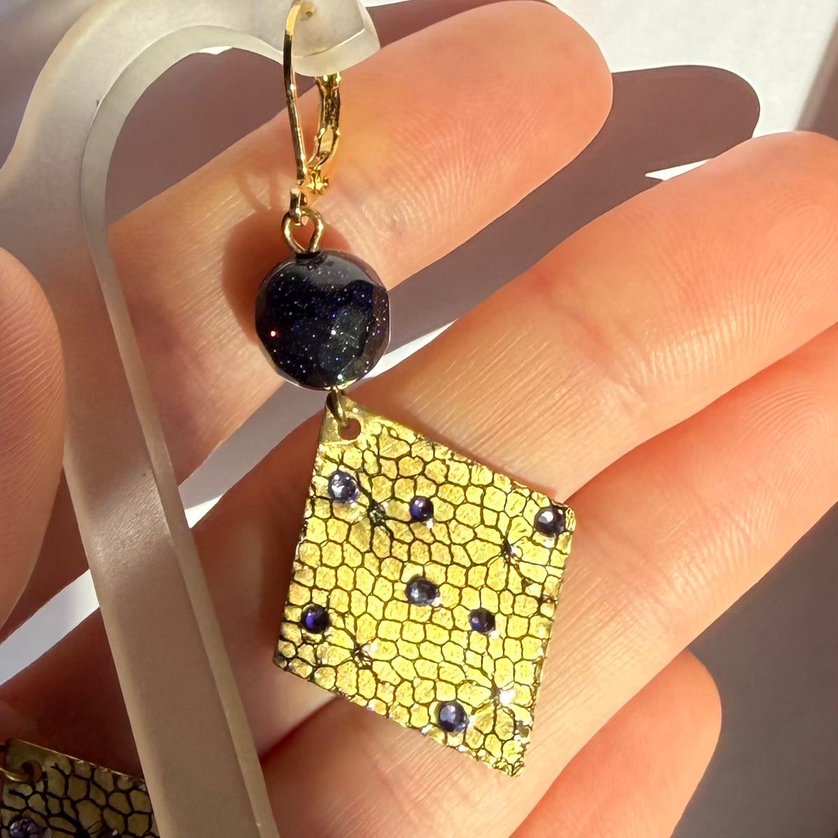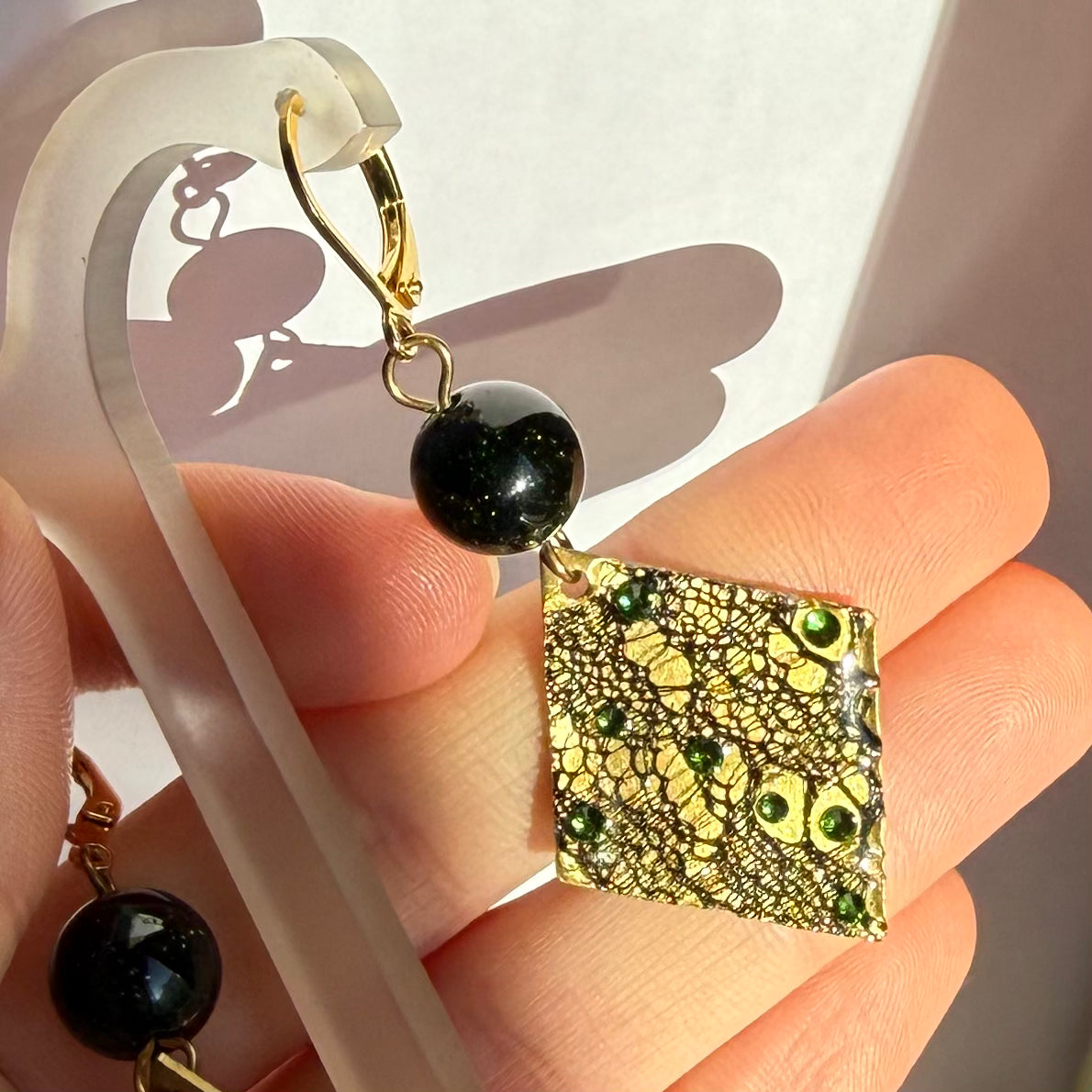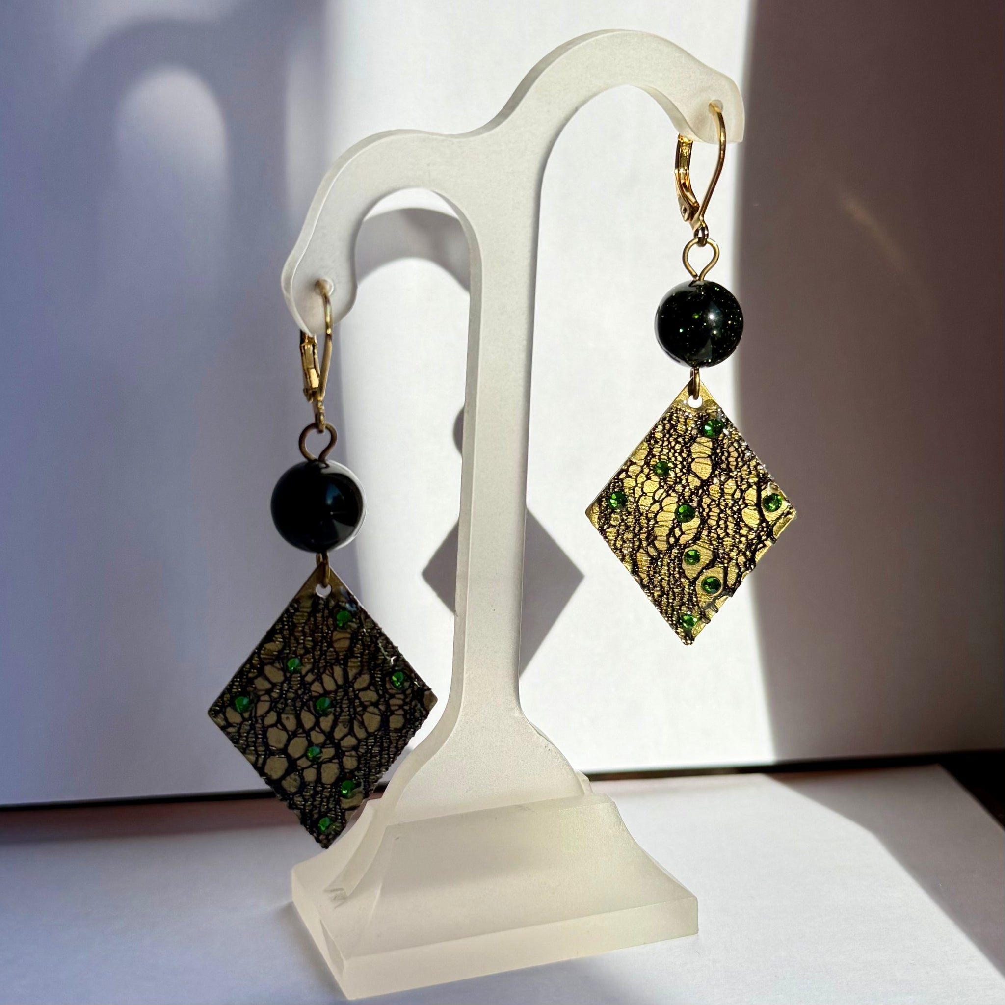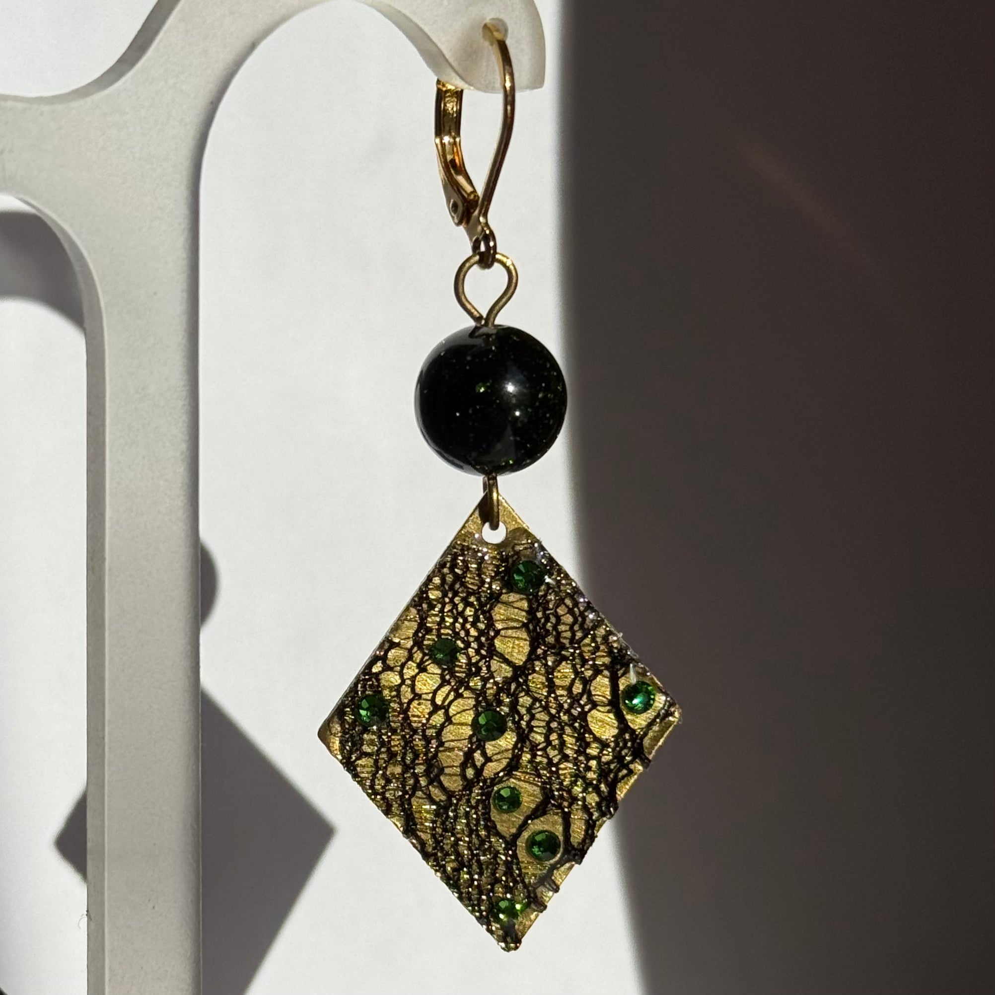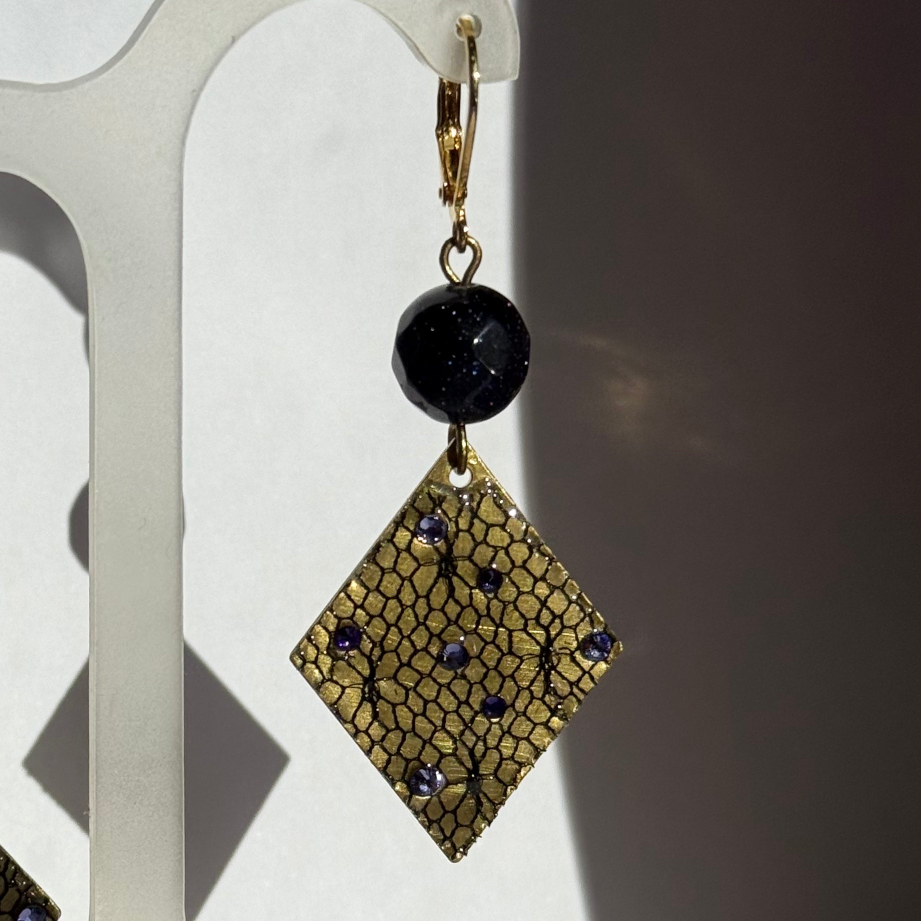 Romba formas auskari, dekorēti ar 2 gab. Smilšakmens pērlēm, melnu zelta mežģīni emaljā un Swarovski kristāliem.